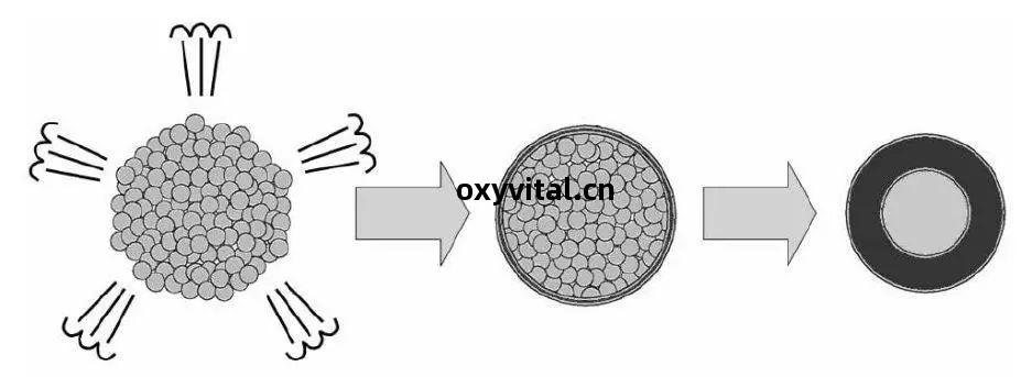 噴霧(wu)幹燥法(fa)是制備噴(pen)塗塗層用原(yuan)料的重(zhong)要(yao)方(fang)法(fa),通過(guo)使(shi)用適當(dang)的有(you)機黏(nian)合(he)劑(ji)聚(ju)集不同的小顆粒(li)進(jin)而從(cong)漿(jiang)料中經(jing)幹燥獲取(qu)顆粒(li)團(tuan)聚(ju)體。漿(jiang)料在幹燥過(guo)程(cheng)中(zhong)發生(sheng)快(kuai)速(su)傳(chuan)熱(re)和(he)傳質(zhi),根(gen)據(ju)操作參(can)數、漿(jiang)料特性的不同,得(de)到(dao)諸如(ru)空(kong)心、致密(mi)、多孔等形(xing)態(tai)各(ge)異的球(qiu)形(xing)或(huo)其他(ta)形(xing)狀(zhuang)的顆粒(li)團(tuan)聚(ju)體[32,33]。噴(pen)霧(wu)造粒(li)得(de)到(dao)不(bu)同結(jie)構(gou)的團(tuan)聚(ju)顆粒(li)如(ru)圖(tu)2[32]所(suo)示。漿(jiang)料在噴(pen)霧(wu)幹燥過(guo)程(cheng)霧(wu)化(hua)為球(qiu)形(xing)液(ye)滴後(hou)的快速(su)幹燥階(jie)段(duan),液(ye)滴中(zhong)的水(shui)分(fen)快速(su)蒸(zheng)發產(chan)生(sheng)毛(mao)細(xi)管(guan)力(li),進(jin)而液(ye)滴內(nei)部(bu)的細小顆粒(li)在(zai)毛(mao)細(xi)管力(li)的作用下向表面(mian)遷移並(bing)最終形(xing)成(cheng)空心顆粒(li),如(ru)圖(tu)3[34]所(suo)示。因(yin)此(ci),在(zai)噴(pen)霧(wu)幹燥過(guo)程(cheng)中(zhong),漿(jiang)料的分散性(xing)是(shi)決定團(tuan)聚(ju)顆粒(li)結(jie)構(gou)的關鍵(jian)因素,高(gao)分(fen)散性(xing)漿(jiang)料中細(xi)小顆粒(li)的遷移阻力(li)更(geng)小,更(geng)有(you)助(zhu)於(yu)獲取(qu)具(ju)有(you)空(kong)心結(jie)構(gou)的顆粒(li)團(tuan)聚(ju)體。