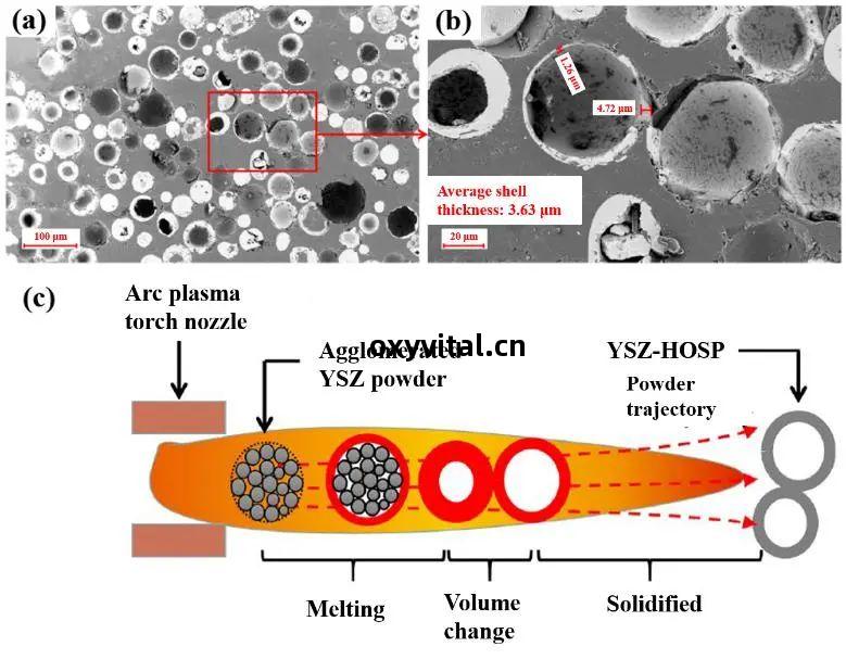 圖(tu)5 等離子(zi)燒結(jie)法(fa)制備的空心微球(qiu)及(ji)空(kong)心化(hua)過程[52]:(a), (b) 空(kong)心微球(qiu)截面(mian)顯微(wei)圖像(xiang); (c) 空心化(hua)過程示意圖Fig.5 YSZ hollow microspheres prepared by plasma sintering and their formation process[52]: (a), (b) microscopic images of the cross-section of hollow microspheres; (c) schematic diagram of formation process of YSZ hollow microspheres研究者(zhe)將等離子(zi)體(ti)燒結(jie)制備空(kong)心微球(qiu)的過程(cheng)分為(wei)熔(rong)化(hua)、體積(ji)變化(hua)及(ji)固化(hua)三(san)個階段(duan)。在(zai)熔化(hua)階段,粉(fen)末(mo)中的氣體(ti)被加(jia)熱(re)、膨(peng)脹、逃(tao)逸(yi),若(ruo)等離子(zi)體(ti)提供(gong)的焓不(bu)足(zu),則(ze)難(nan)以(yi)將粉(fen)末(mo)熔化(hua),熱(re)壁(bi)噴嘴(zui)可以提供(gong)足(zu)夠的焓以(yi)及(ji)適合(he)的粉(fen)末(mo)加(jia)熱(re)速(su)率(lv)使(shi)得(de)顆粒(li)中(zhong)的大部(bu)分氣體(ti)得以保(bao)留(liu),從(cong)而(er)確(que)保(bao)了(le)顆粒(li)的球(qiu)化(hua)率及(ji)顆粒(li)中(zhong)的氣體(ti)含量(liang);在(zai)體(ti)積(ji)變化(hua)階段,液(ye)滴內(nei)部(bu)氣體壓(ya)力(li)、表面(mian)張力(li)及(ji)環(huan)境壓(ya)力(li)三(san)者(zhe)間保持平衡(heng)[51],提升(sheng)初(chu)始(shi)團(tuan)聚(ju)粉(fen)末(mo)的孔隙(xi)率(lv)、提高(gao)等離子(zi)體(ti)射(she)流(liu)的溫(wen)度(du)以及(ji)降低等離子(zi)體(ti)射(she)流(liu)的內(nei)部(bu)壓(ya)力(li)將更(geng)有(you)助(zhu)於(yu)獲得(de)薄(bo)壁空(kong)心顆粒(li);在(zai)固化(hua)階段,適當(dang)降低液(ye)滴的冷卻(que)固化(hua)速(su)率(lv)將更(geng)有(you)助(zhu)於(yu)獲得(de)高(gao)空(kong)心化(hua)率的粉(fen)末(mo)。因此,等離子(zi)體(ti)燒結(jie)法(fa)制備ZrO2空(kong)心微球(qiu)時,所(suo)用前驅物的特性、等離子(zi)體(ti)參(can)數的優化(hua)以及(ji)燒結(jie)過程(cheng)的控制都將對空(kong)心微球(qiu)的性能產生(sheng)重(zhong)要(yao)影(ying)響。ZrO2空心微球(qiu)不(bu)同制備方(fang)法(fa)的特點如(ru)表1所示。模(mo)板(ban)法(fa)是制備空(kong)心微球(qiu)的常(chang)用方法(fa),模板(ban)法(fa)制備的ZrO2空心微球(qiu)具(ju)有(you)粒(li)度(du)分布(bu)窄、空心化(hua)率高(gao)等優勢(shi),但(dan)往往(wang)存在(zai)模板(ban)合(he)成(cheng)及(ji)後(hou)續去除(chu)過(guo)程(cheng)繁(fan)瑣(suo)等問題(ti)。溶劑(ji)熱(re)法(fa)制備空(kong)心微球(qiu)時不(bu)使(shi)用模板(ban),得到(dao)的粉(fen)體(ti)具(ju)有(you)粒(li)度(du)分布(bu)窄、形(xing)貌(mao)可控的優點(dian),但(dan)是溶(rong)劑熱(re)法(fa)反(fan)應條件(jian)苛(ke)刻(ke),難(nan)以(yi)進(jin)行批(pi)量(liang)化(hua)制備。噴(pen)霧(wu)幹燥法(fa)和等離子(zi)燒結(jie)法(fa)是批(pi)量(liang)制備噴(pen)塗用ZrO2空心微球(qiu)的重(zhong)要(yao)方(fang)法(fa),其中(zhong)噴(pen)霧(wu)幹燥法(fa)得到(dao)的空心顆粒(li)強度(du)較低(di)。等離子(zi)體(ti)燒結(jie)後制備得(de)到(dao)的空心微球(qiu)強度(du)相對較高(gao)、流(liu)動(dong)性(xing)好(hao),可以直(zhi)接(jie)用於(yu)等離子(zi)噴(pen)塗。